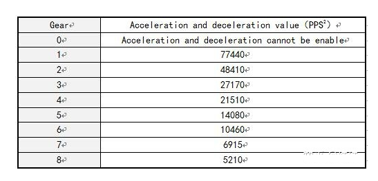 如下圖圖示,42mm兩相混合式步進電機系列系統總線中小型步進電機控制器的加加減速機時間分八個級別,各自相匹配1-8的加降速指數,標值越倍加減速時間越長