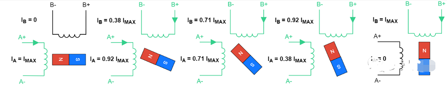 微步運(yùn)動(dòng)舉例:在圖1中,A線圈通滿電流,圖2中A線圈通最大電流的0.92倍,而B線圈通最大電流的0.38倍,實(shí)現(xiàn)22.5°旋轉(zhuǎn)。同理,圖3中,A和B線圈同時(shí)通最大電流的0.71倍,可以實(shí)現(xiàn)45°旋轉(zhuǎn)。
