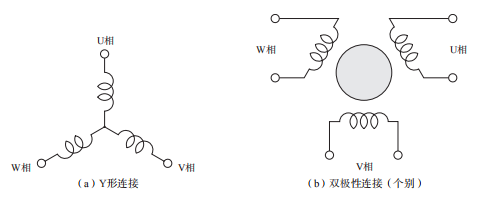 圖 3(a)所示的是三相繞組(U、V、W)采用 Y 形連接(星形連接)的方式。這種方式需要引出 3 個接線端子,需要采用 6 個晶體管的三相橋式電路驅動。但是,這種方式只能進行二相激勵。如果你想分別單獨控制各相的電流,則需要 如圖 3(b)所示從每相引出 2 個端子,且需要 3 組全橋電路來驅動。