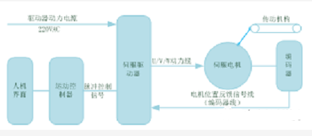 伺服控制過程,如上圖。操作者通過人機(jī)界面(觸摸屏、PC、液晶屏等)將數(shù)據(jù)設(shè)定到運(yùn)動(dòng)控制器。在由運(yùn)動(dòng)控制器將伺服控制信號(位置、速度、方向、軌跡等信息)傳遞到伺服驅(qū)動(dòng)器,驅(qū)動(dòng)器將控制信號轉(zhuǎn)化到電機(jī)的位置、速度、方向、軌跡,繼而拖動(dòng)傳動(dòng)機(jī)構(gòu)實(shí)現(xiàn)機(jī)構(gòu)的運(yùn)動(dòng)控制。伺服電機(jī)編碼器將自身旋轉(zhuǎn)過的實(shí)際位置反饋到伺服驅(qū)動(dòng)器,進(jìn)行實(shí)時(shí)的位置糾偏控制,以達(dá)到精準(zhǔn)位置控制。
