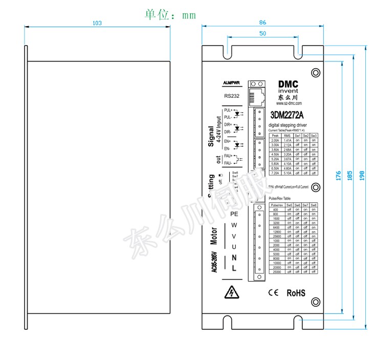 3DM2272A是基于DSP控制的高壓三相步進電機驅(qū)動器。它是將先進的DSP控制芯片和三相逆變驅(qū)動模塊結(jié)合一起所構(gòu)成的新一代數(shù)字步進電機驅(qū)動器。驅(qū)動電壓為AC85V-220V,適配電流在7.2A以下、外徑86-130mm的各種型號的三相混合式步進電機。該驅(qū)動器內(nèi)部采用類似伺服控制原理的電路,此電路可以使電機運行平穩(wěn),由于采用了平滑技術(shù),低速時幾乎沒有震動和噪音,電機在高速時,仍保持較大的力矩。定位精度最高可達25600步/轉(zhuǎn)。
