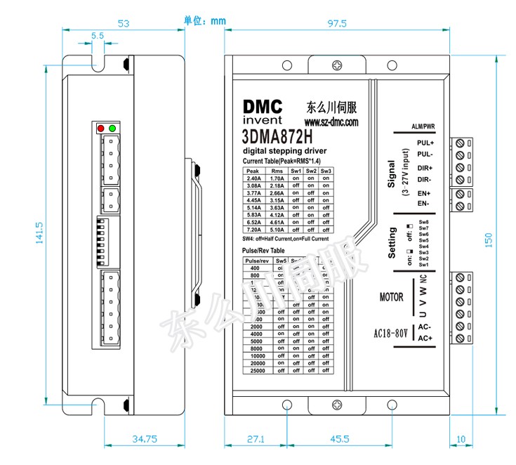 | 安裝說明 | 驅(qū)動器的外形尺寸為:151×97×53mm,安裝孔距為139mmmm。既可以臥式和立式安裝,建議采用立式安裝。安裝時(shí),應(yīng)使其緊貼在金屬機(jī)柜上以利于散熱。 |