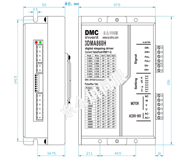 3DMA860H 產品是東么川公司采用先進的 DSP 控制芯片與獨特的控制電路結合一起所構成的新一代智能數字式細分型步進電機驅動器?;诰艿腜ID 電流控制算法設計,高速大力矩輸出。靜止時動態電流自動減半,使電機溫升大為降低,最大限度發揮電機的性能。用戶可以設置1~128 細分。低、 中、高速運行都非常平穩,幾乎沒有振動和噪音,完全解決了步進電機低速振動和噪音的缺陷。驅動器內部集成了參數自動調整功能 , 能夠針對不同參數電機自動生成最優的運行參數。