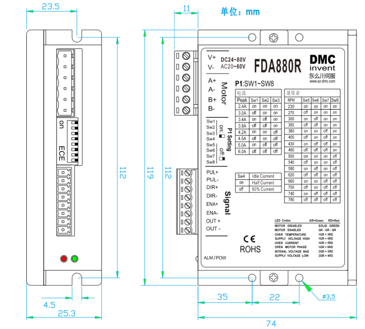 FD880R產品是東么川公司采用先進的DSP控制芯片與獨特的控制電路結合 一起所構成的新一代智能數字式細分型步進電機驅動器,基于精密的PID電流控制算法設計,高速大力矩輸出,靜止時動態(tài)電流自動減半,使電機溫升大為降低,最大限度發(fā)揮電機的性能,用戶可以設置1—12細分,低中,高速運行都非常平穩(wěn),幾乎沒有振動和噪音,安全解決了步進電機低速振動和噪音的缺陷,驅動器內部集成了參數自動調整功能,能針對不同參數電機自動生成最優(yōu)的運行參數。
